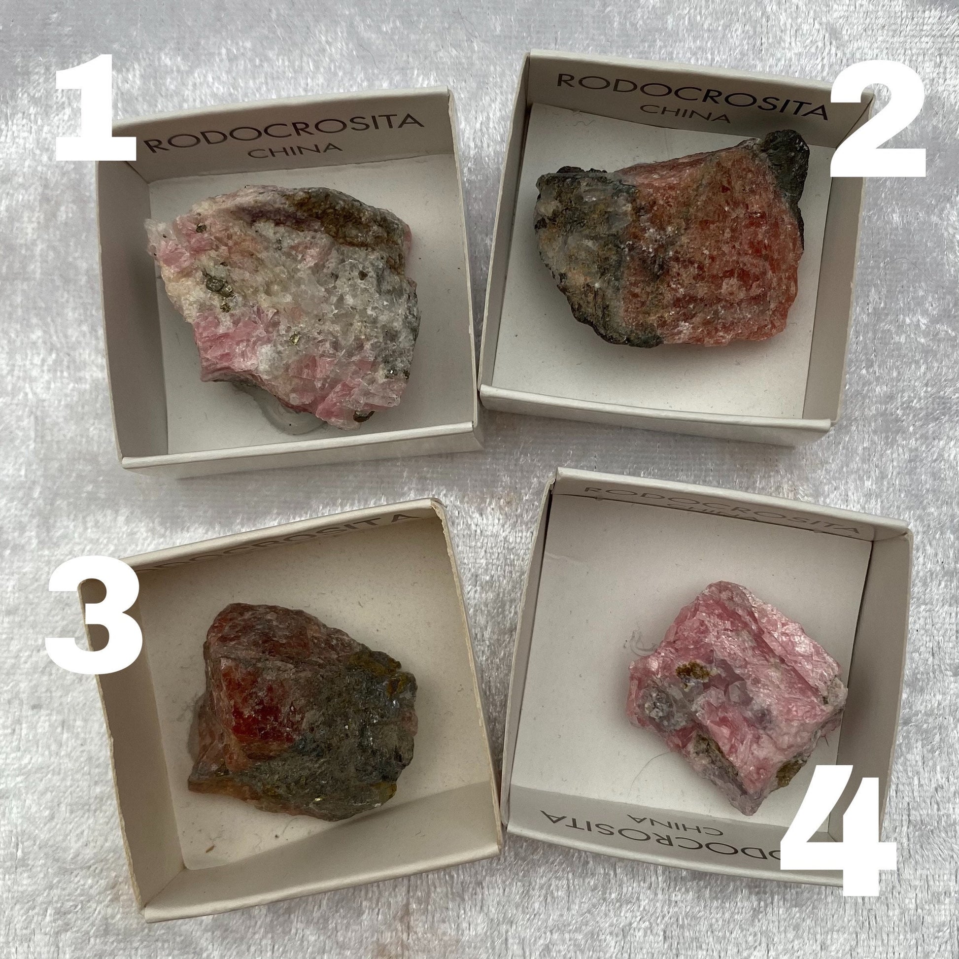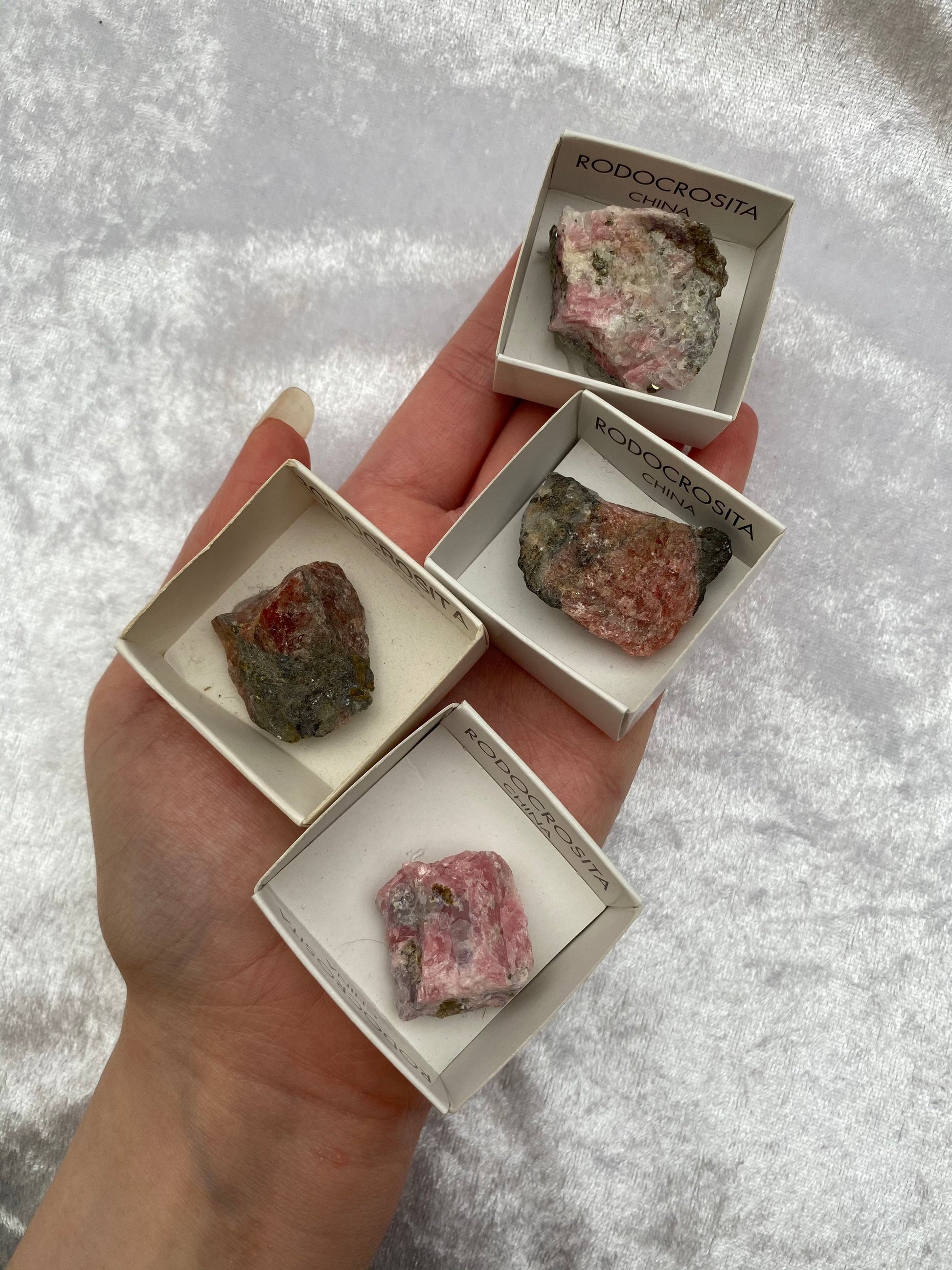 The name rhodochrosite comes from two Greek words meaning “rose coloured.” The distinctive pale pink to deep rose colour of this crystal is caused by the mineral Manganese within it.