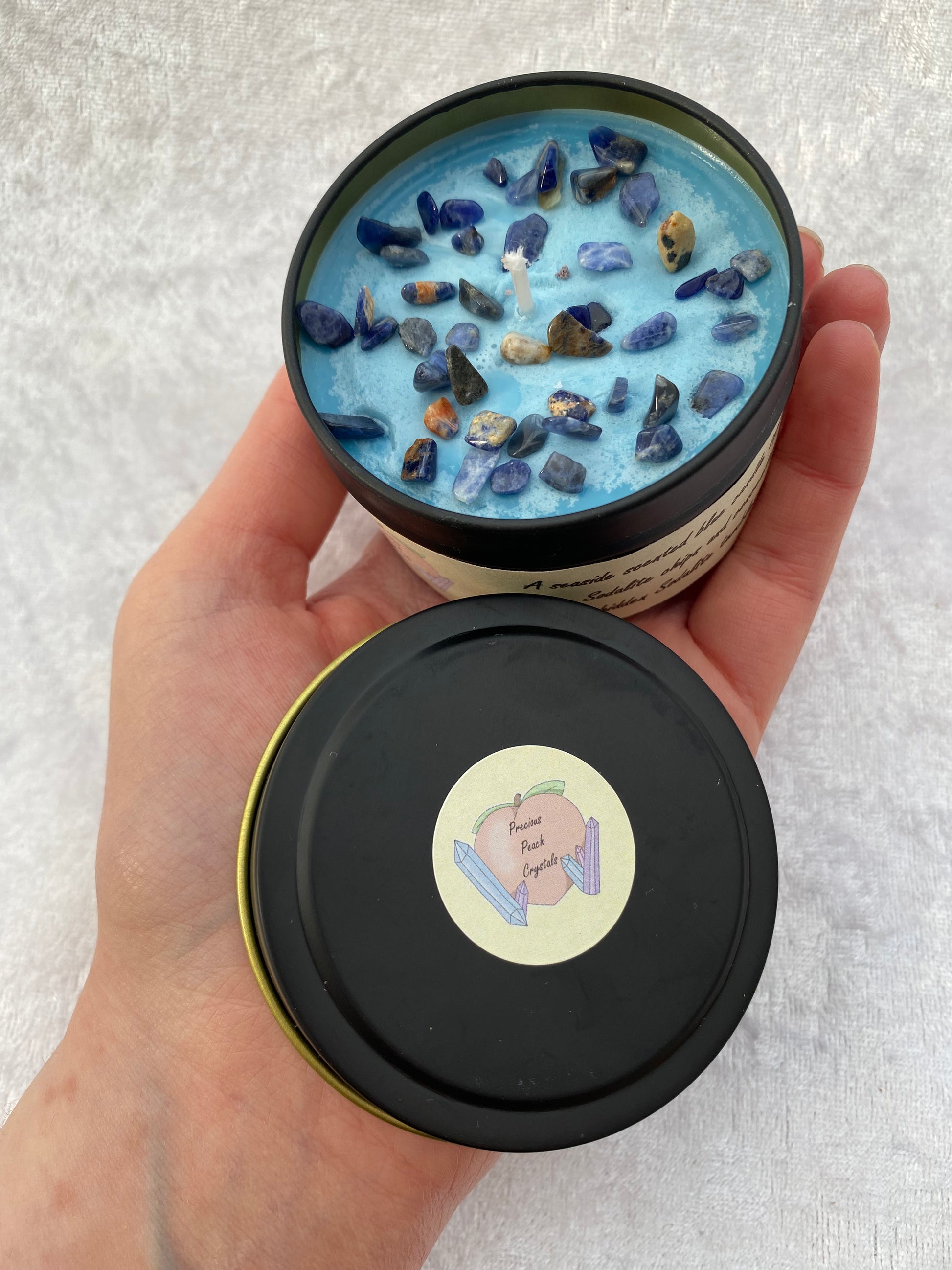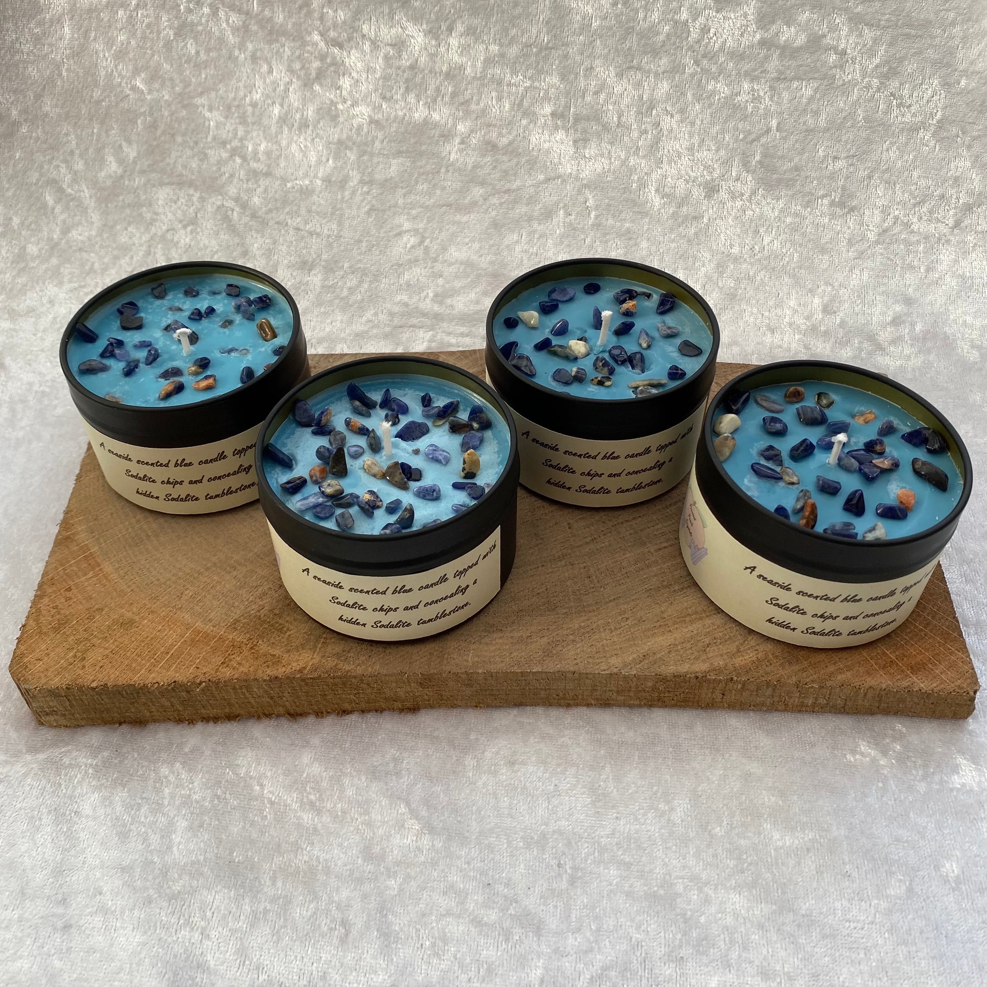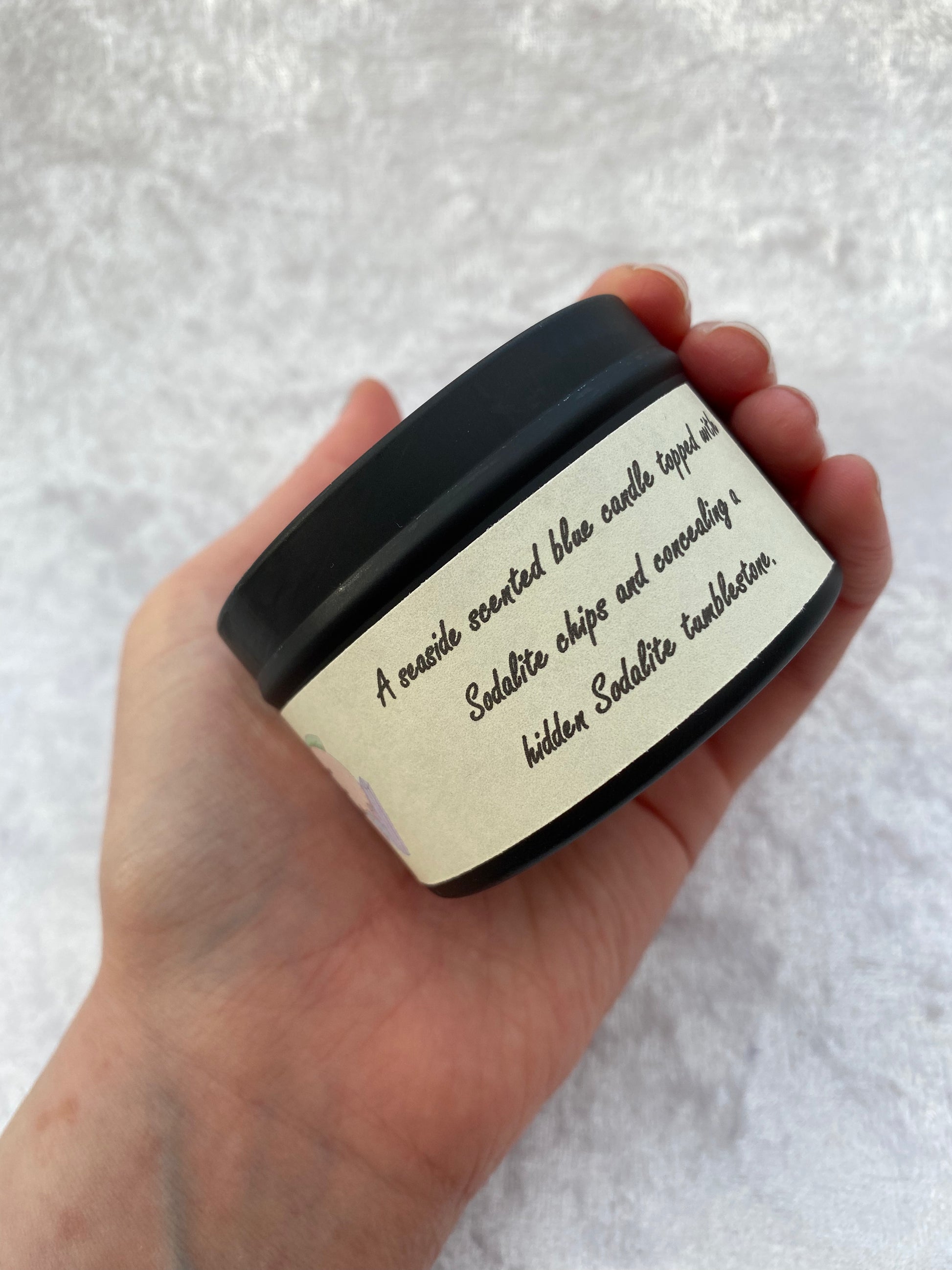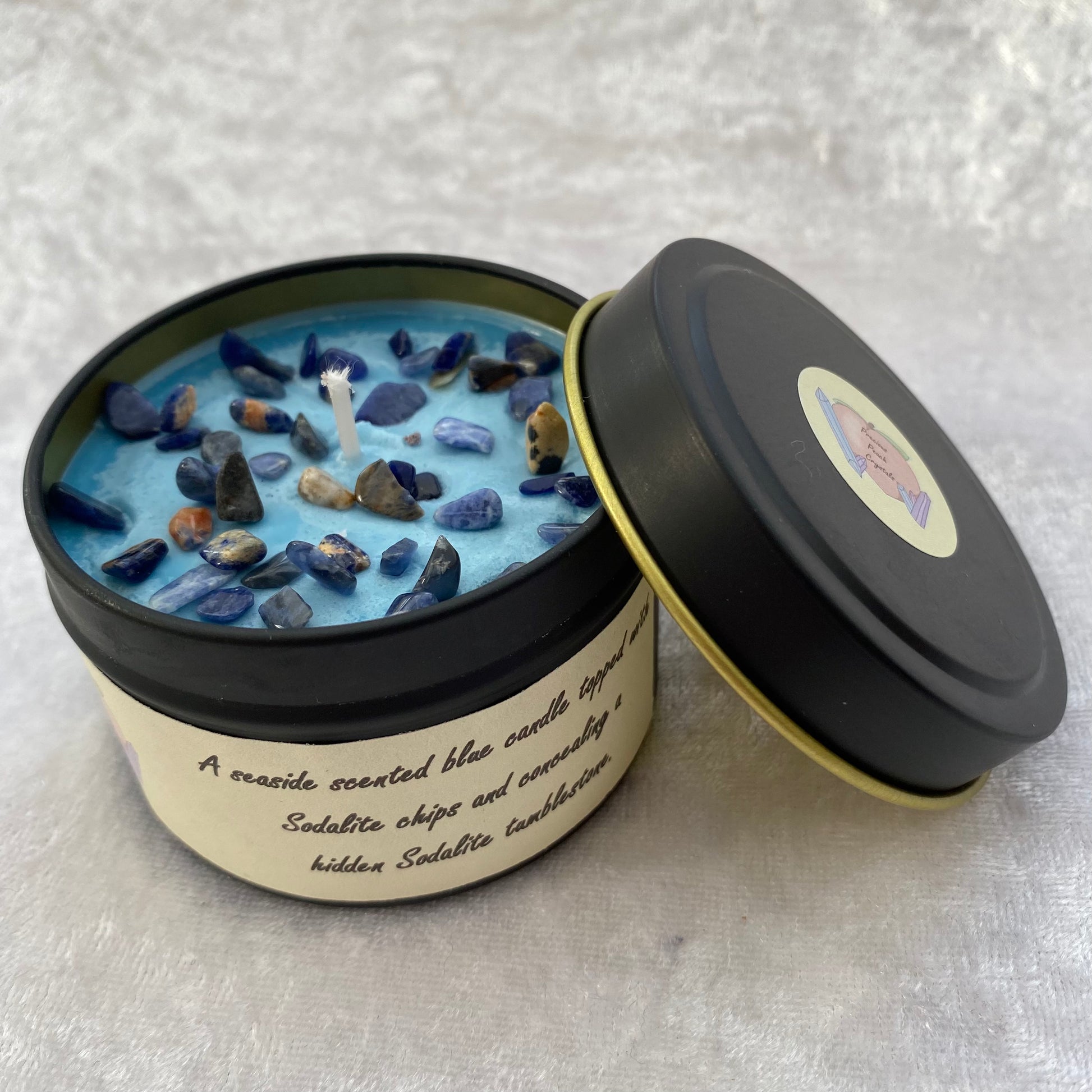 A seaside scented blue candle topped with Sodalite chips and concealing a hidden Sodalite tumblestone to uncover as the candle burns.