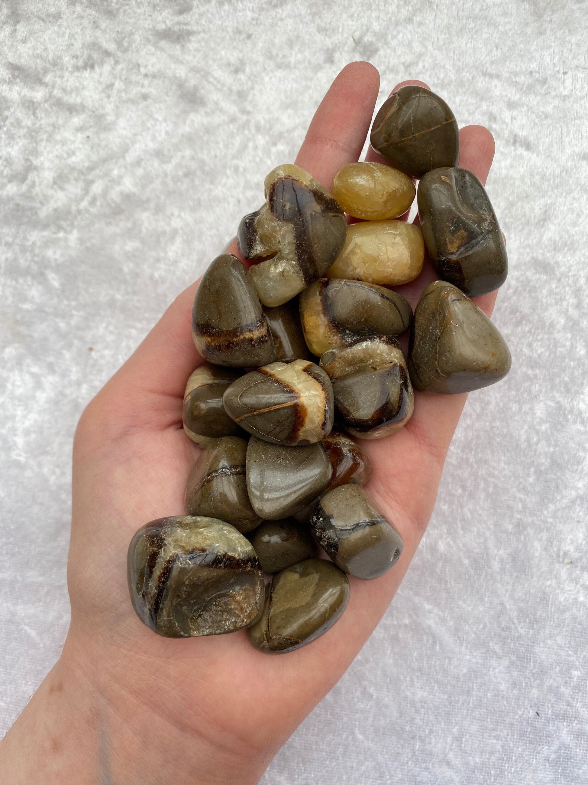 Septarian specimens are geodes that are a combination of yellow calcite, brown aragonite, grey limestone and white or clear barite. They form when cracks are filled with concretions in shallow lakes.