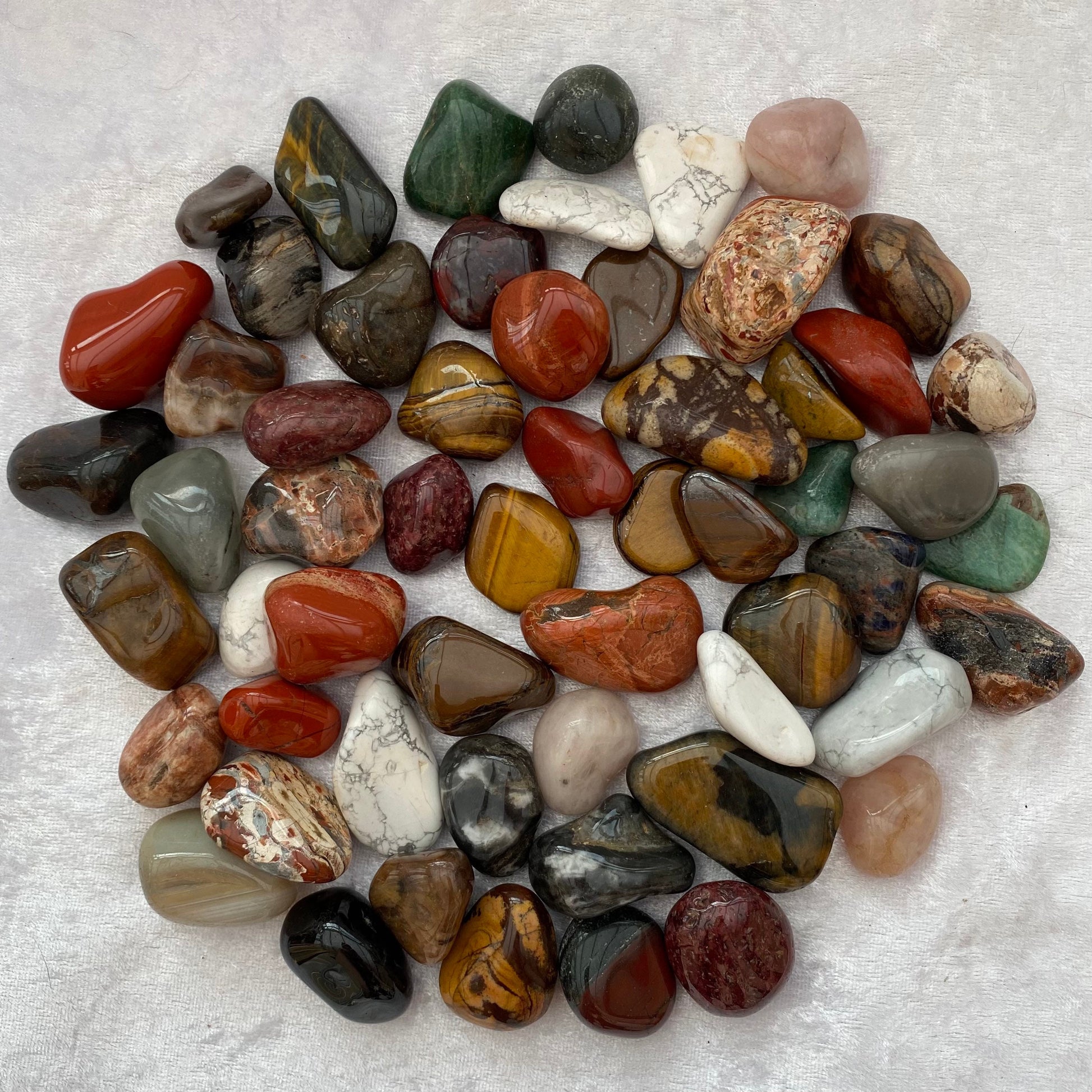 A mix of stones from South Africa including Red Jasper, Rose Quartz, Black Onyx, White Howlite, Tigers Eye, Blue Tigers Eye, Sodalite, Buddstone, Autumn Leaf Jasper, Yellow Jasper, Seftonite, Silver Leaf Jasper, Petrified Wood, Red River Chalcedony, Satin Leaf Jasper, Brecciated Jasper and Maroon Jasper.