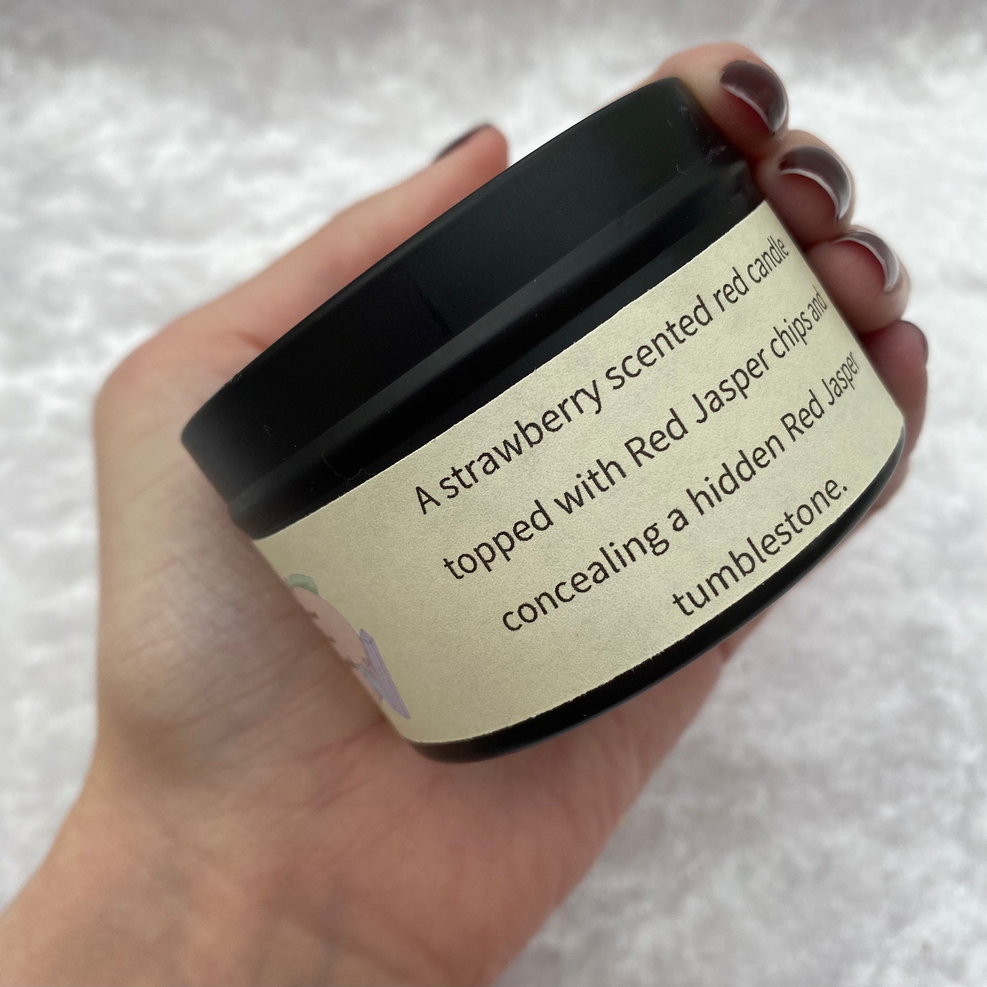 A strawberry scented red candle topped with Red Jasper chips and concealing a hidden Red Jasper tumblestone to uncover as the candle burns.