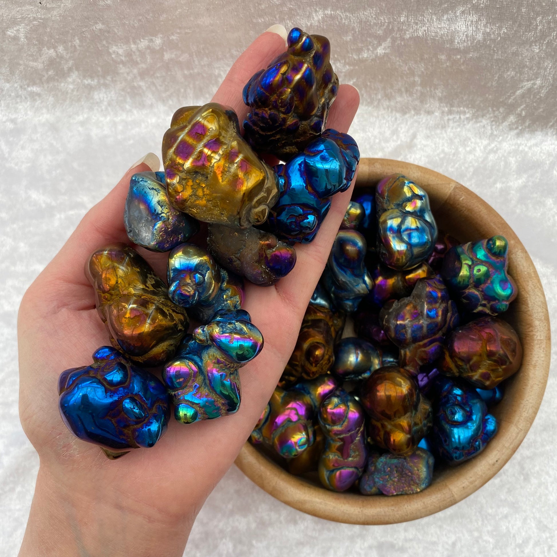 Aura crystals are made by heating Chalcedony crystals to an extremely high temperature then coating them with fine vaporized precious metals. This gives them a rainbow sheen.