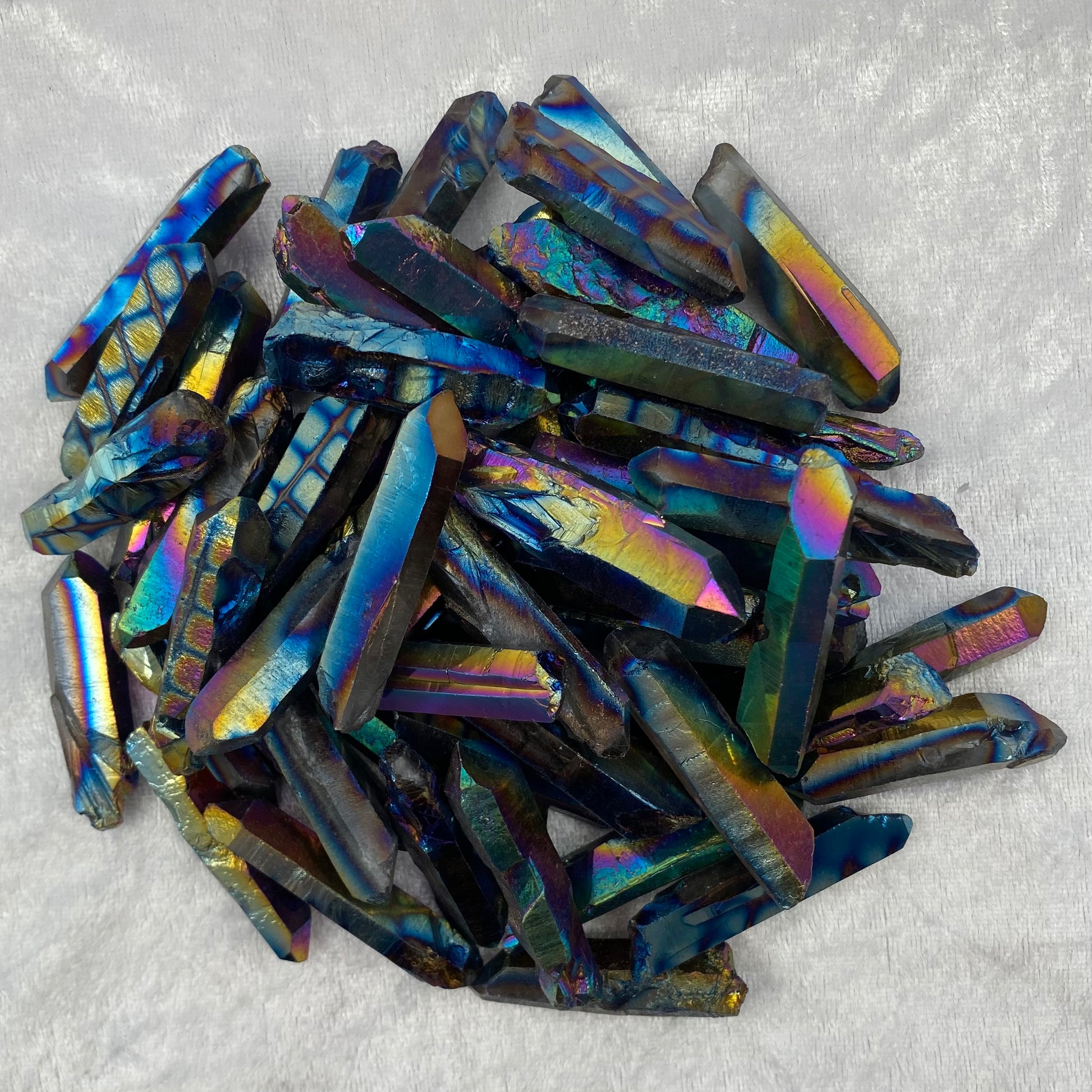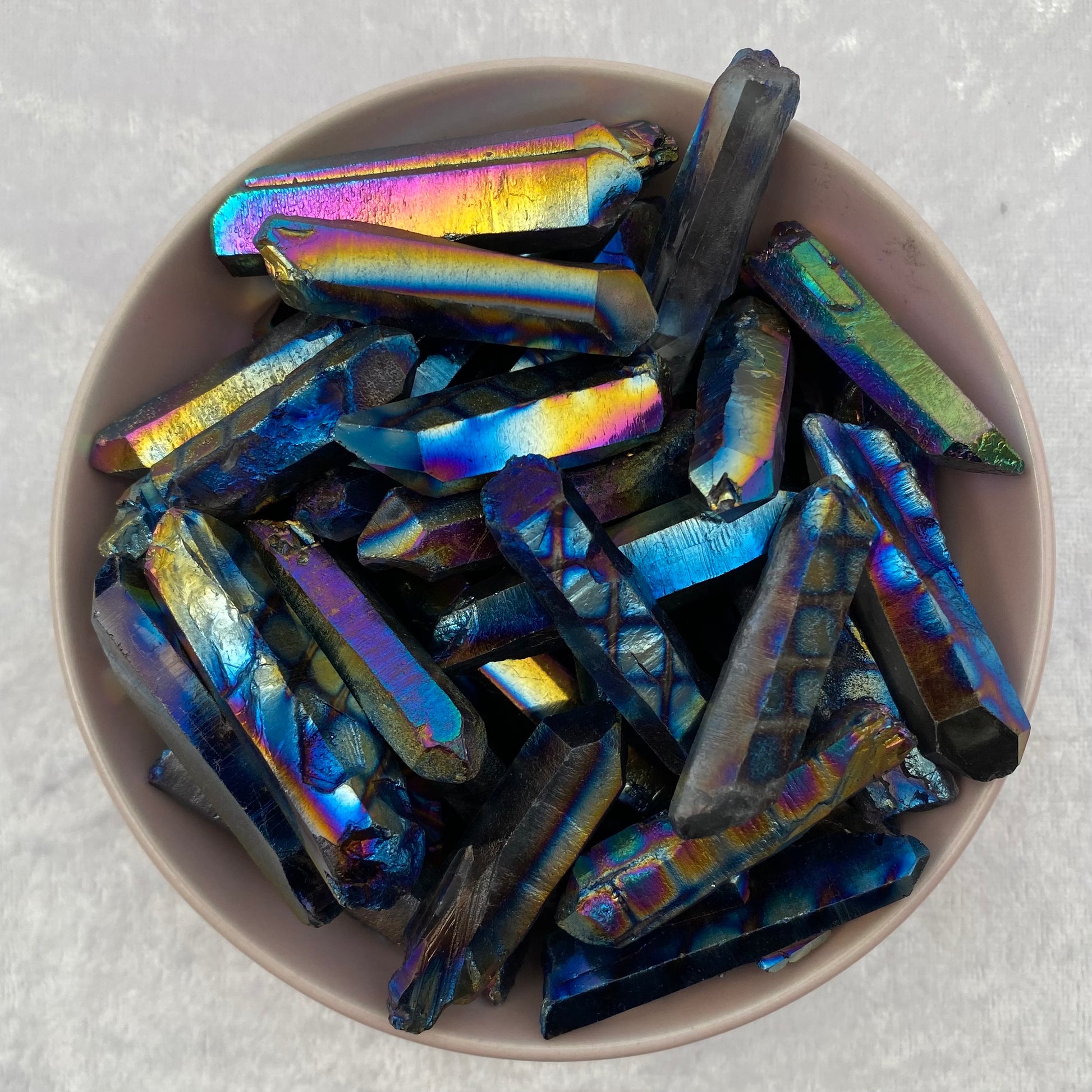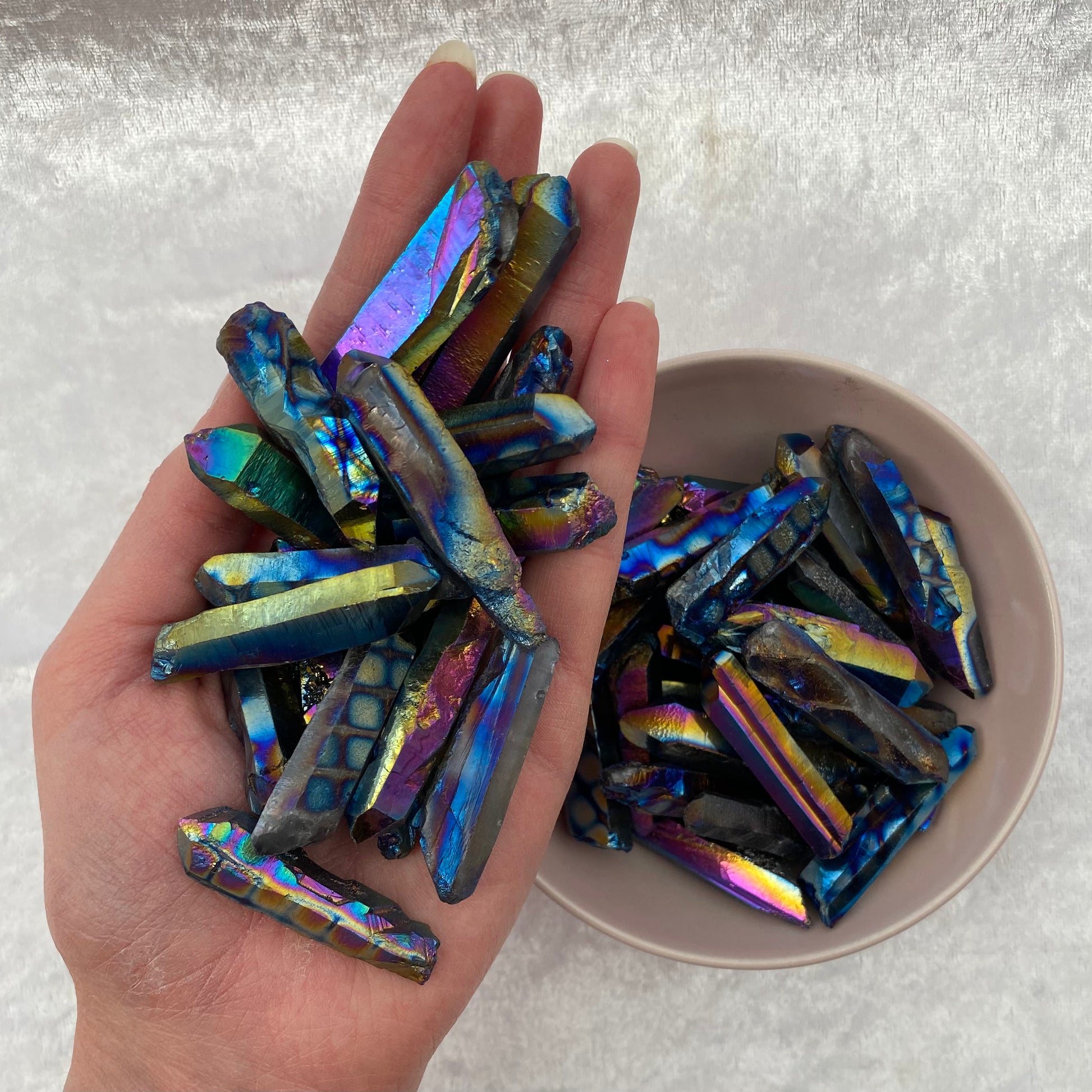 Aura crystals are made by heating Quartz crystals to an extremely high temperature then coating them with fine vaporized precious metals. This gives them a rainbow sheen.