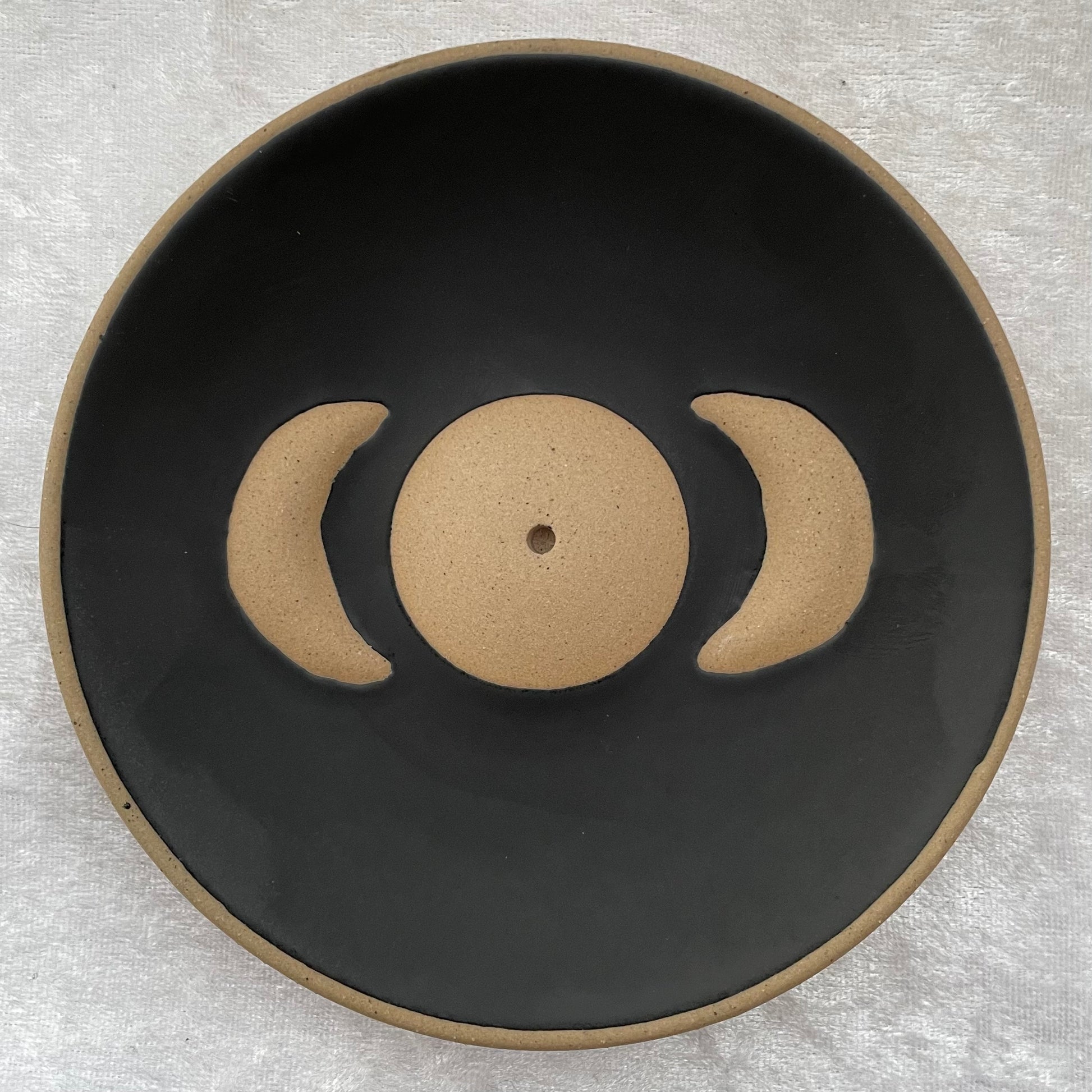 A ceramic incense burner dish with black painted detail and triple moon design for holding incense sticks and catching ash.