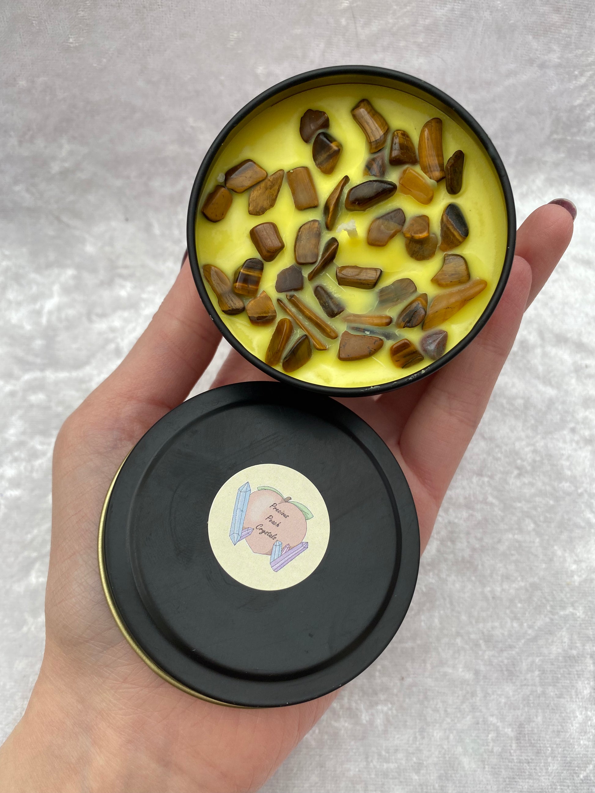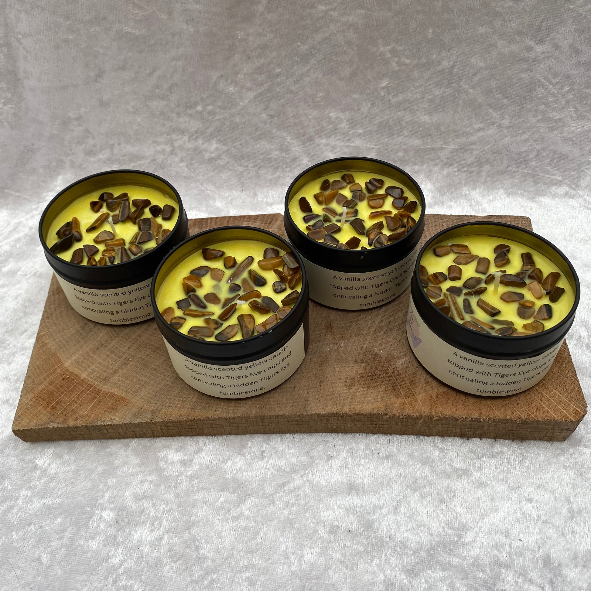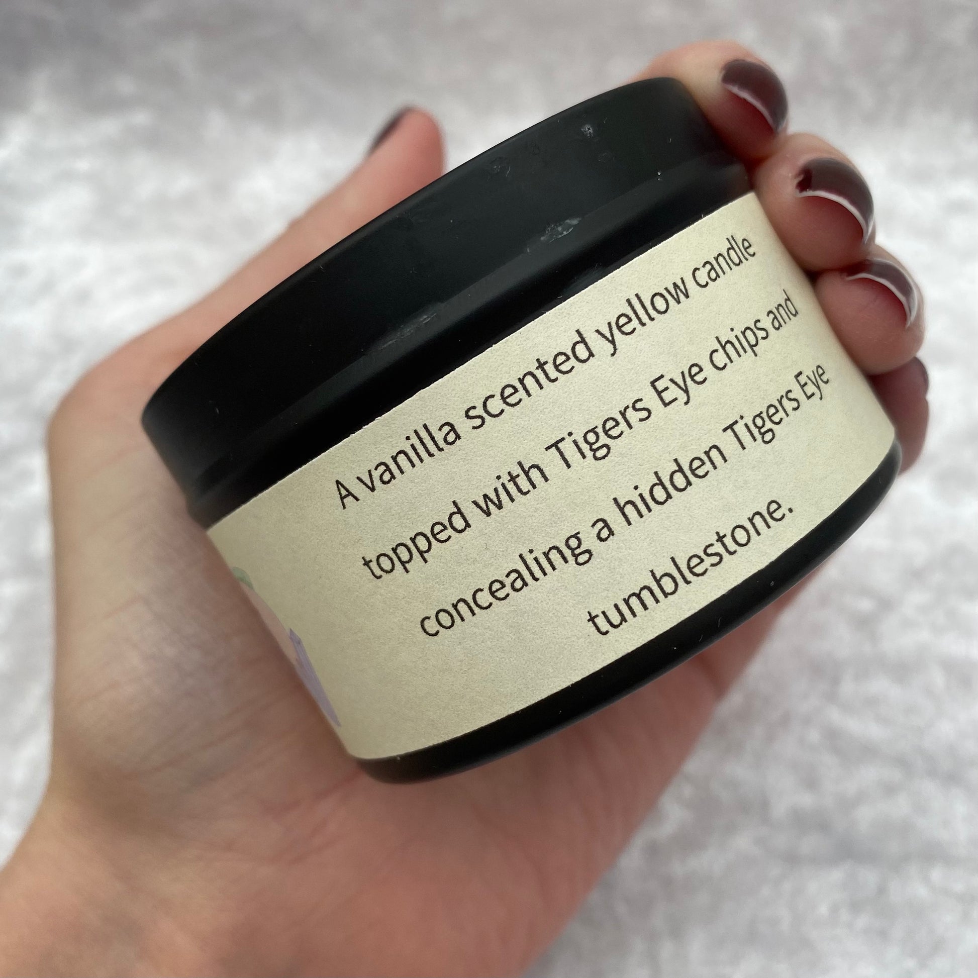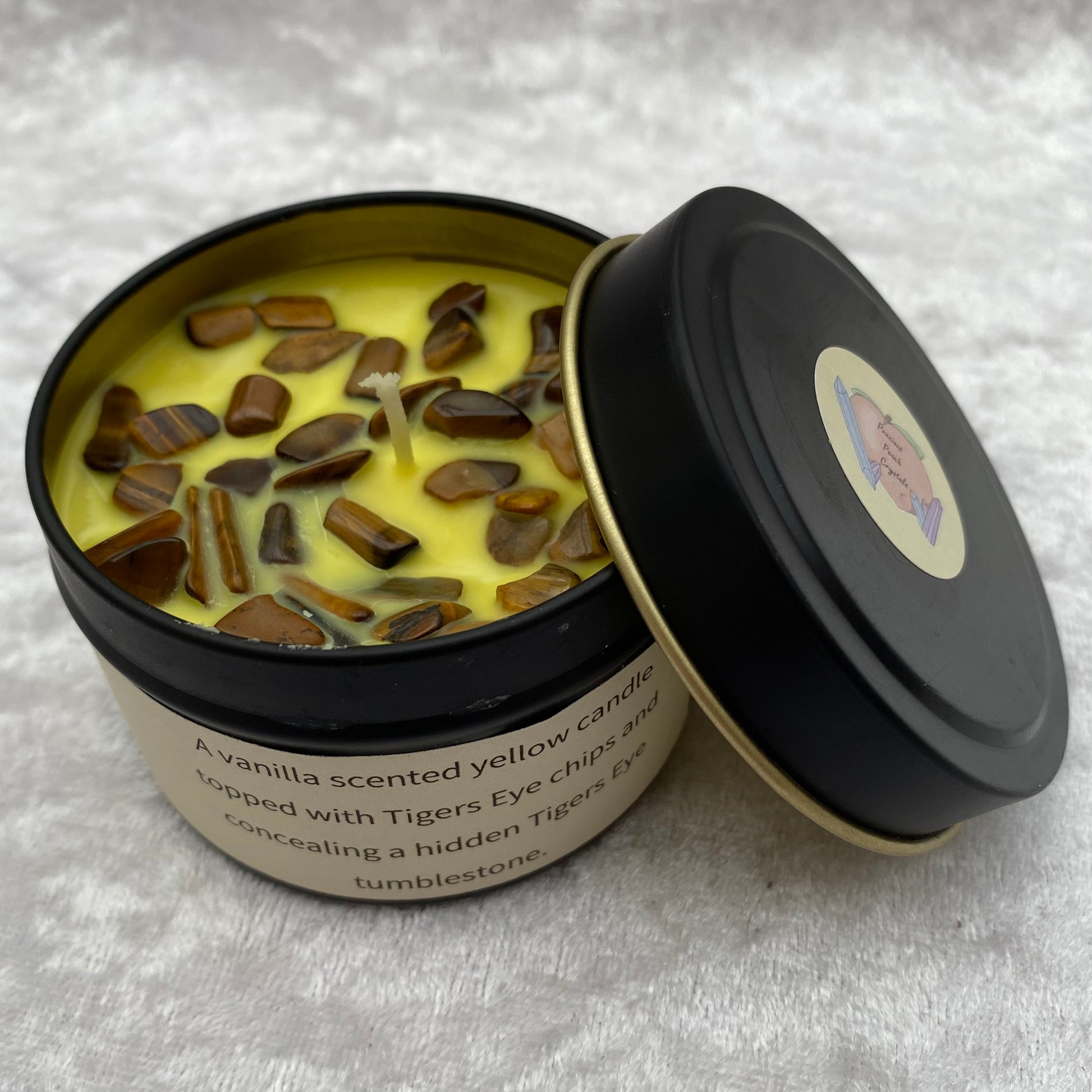 A vanilla scented yellow candle topped with Tigers Eye chips and concealing a hidden Tigers Eye tumblestone to uncover as the candle burns.